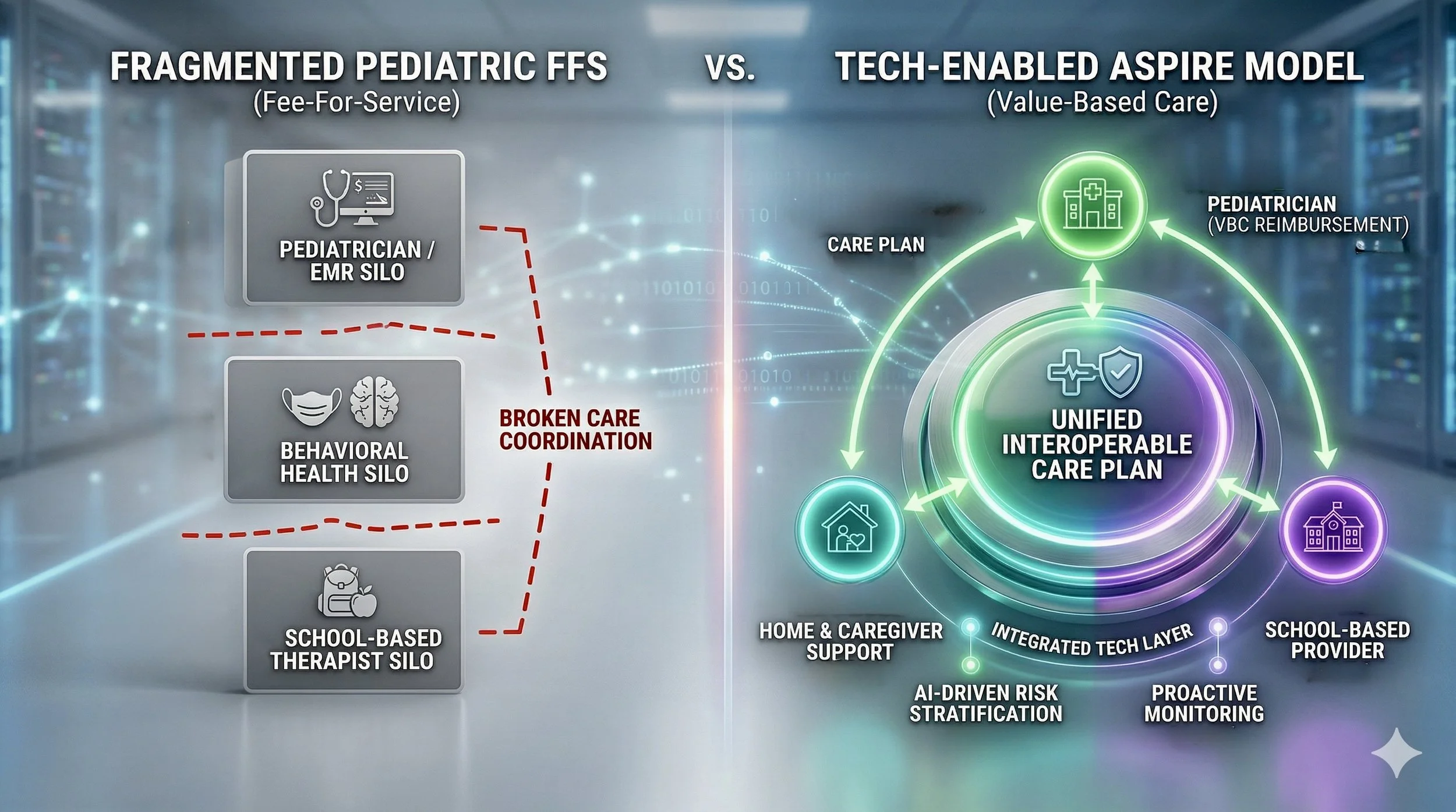 While value-based care (VBC) models are prevalent across the 65+ Medicare population, pediatric care has historically remained rooted in fee-for-service (FFS) models. Traditional FFS reimbursement rarely incentivizes the intensive coordination required to manage children with complex needs, leading to siloed intervention and high system costs. ASPIRE is designed to replace these silos with a "tech-enabled safety net" that rewards organizations for improving whole-person outcomes, not just delivering a volume of "sick care" services.